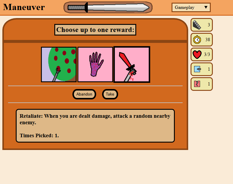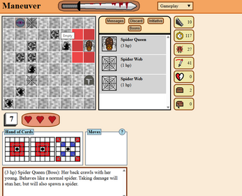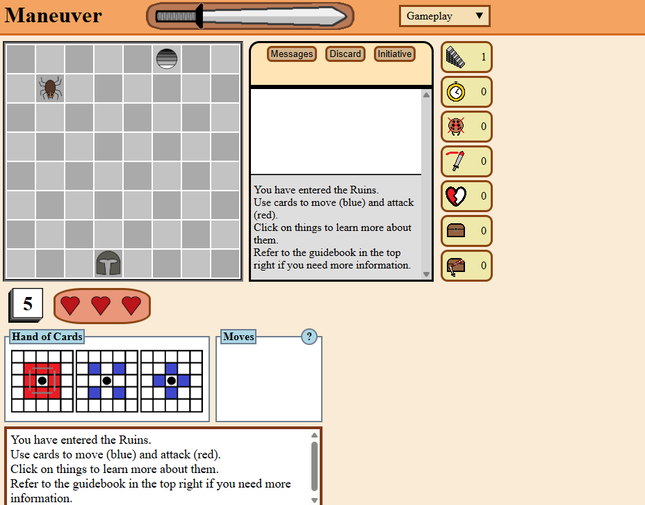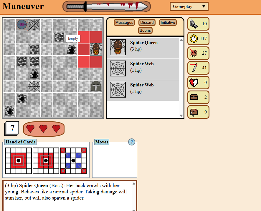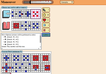 Maneuver is a turn based dungeon crawler where your movement is based on a deck of cards. Utilize cards to traverse the board, moving out of the way of enemy attacks and fighting back. Change up your deck between each floor of the dungeon. Collect powerful boons to supplement your abilities. Travel through 8 different regions, each with a large variety of enemies and a unique boss.